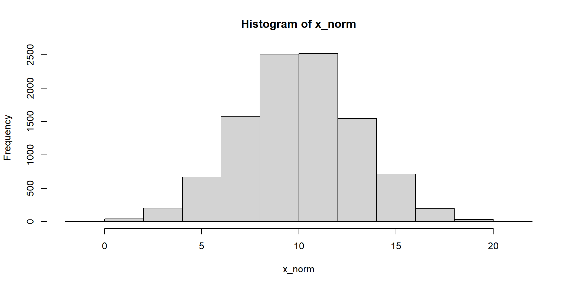 x_norm <- rnorm(10^4, mean = 10 , sd = 3)