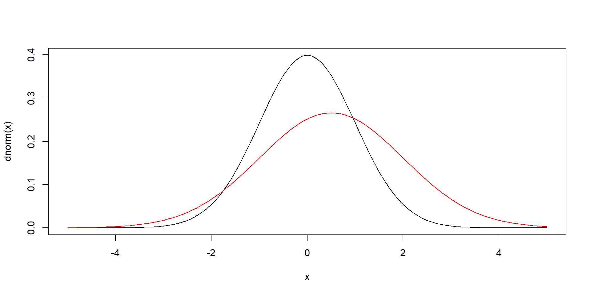 curve(dnorm(x, mean = 0.5, sd = 1.5), from = -5, to = 5, col = "red", add = TRUE)