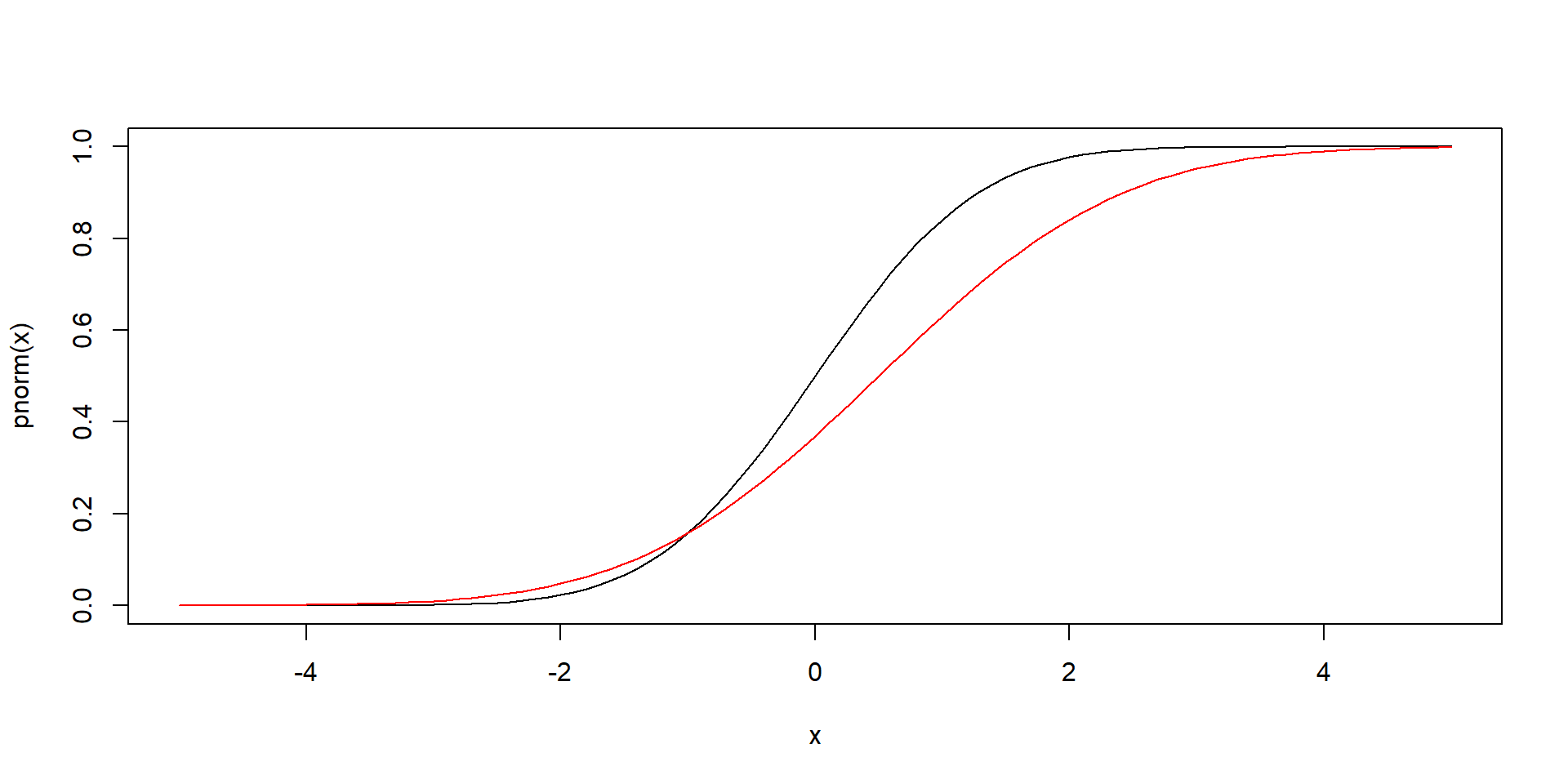 curve(pnorm(x, mean = 0.5, sd = 1.5), from = -5, to = 5, col = "red", add = TRUE)